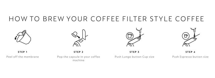 Phương pháp pha Filter Style trên máy Nespresso: Bóc lớp màng nhôm, đặt viên nén vào máy, nhấn nút Lungo, sau đó nhấn nút Espresso.
