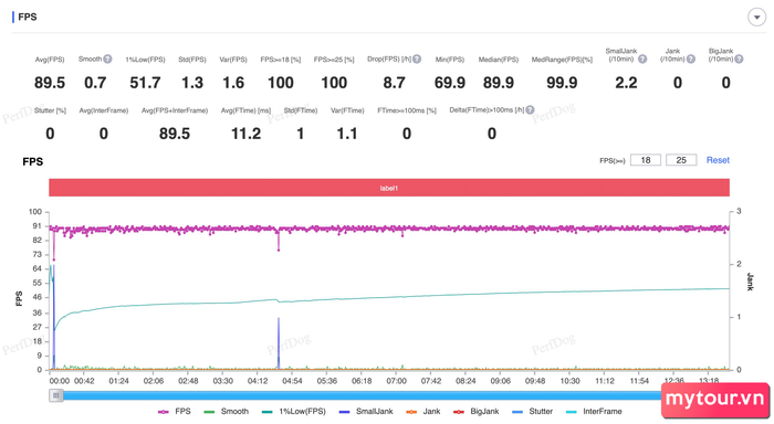 Trong suốt 15 phút chơi game, không có giật lag nào xuất hiện. Dù biểu đồ FPS dao động một chút, nhưng trải nghiệm chơi vẫn mượt mà, không có giật lag hay giảm FPS.