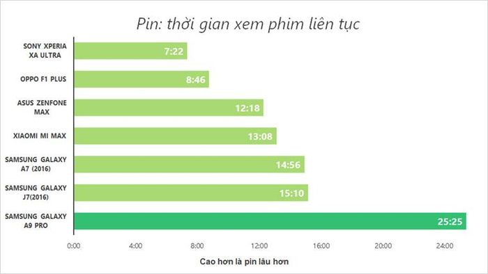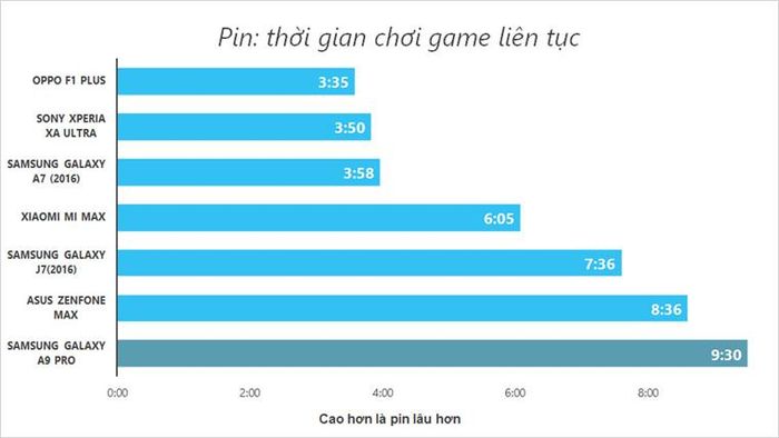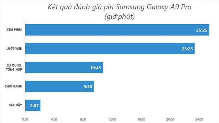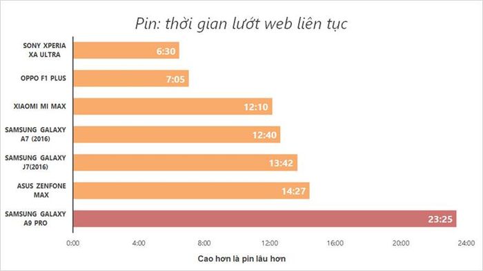 Với những kết quả trên, có thể thấy thời gian sử dụng pin của Galaxy A9 Pro vượt trội hơn so với hầu hết các phablet có màn hình từ 5.5 inch trở lên. So sánh trực tiếp với Asus ZenFone Max, điện thoại có dung lượng pin tương đương (5000 mAh), phần cứng yếu hơn và màn hình độ phân giải thấp hơn (HD), A9 Pro vẫn cho kết quả tốt hơn. Điều này chứng tỏ Samsung đã tối ưu rất tốt về pin trên chiếc A9 Pro nói riêng, và các máy tầm trung năm 2016 nói chung.