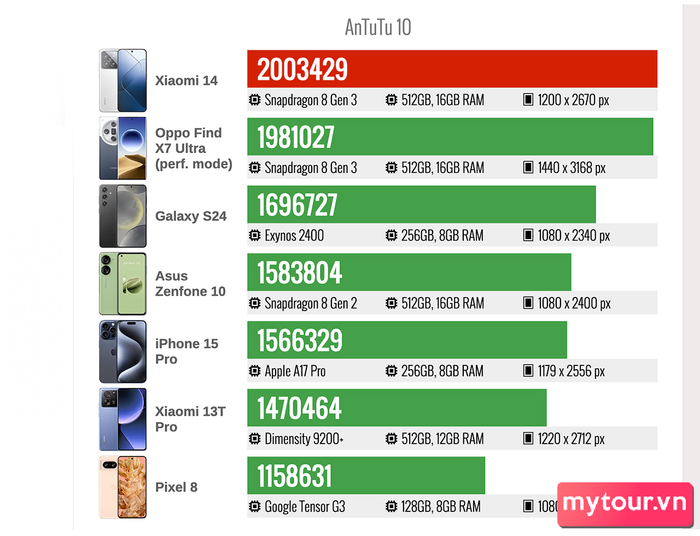 Trên bài test Antutu Benchmark V10, Xiaomi 14 vượt trội với điểm số 2,003,429, vượt qua cả OPPO Find X7 Ultra. Điều này chứng tỏ Xiaomi 14 là một trong những smartphone nhỏ gọn có hệ thống camera hàng đầu.