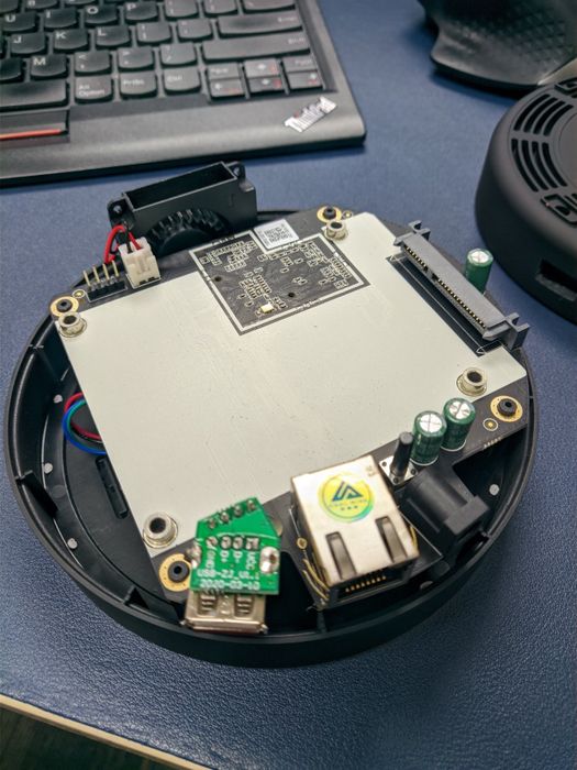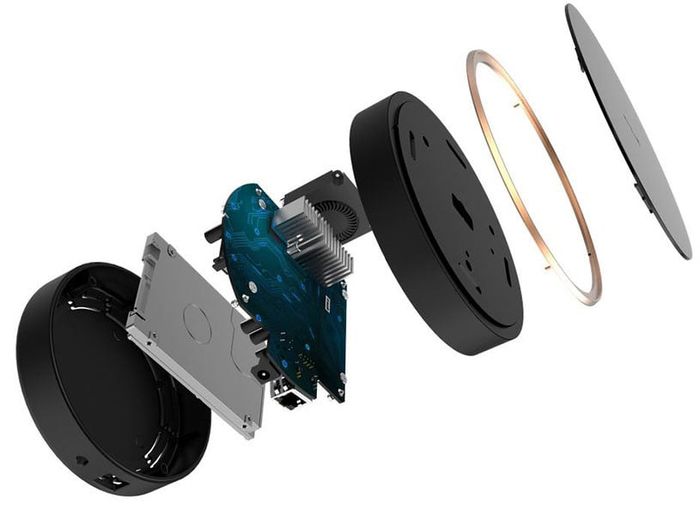 Box nhỏ gọn, hình trụ tròn với thiết kế đơn giản gồm 1 mainboard, tản nhiệt quạt êm ái (kèm lá nhôm tản nhiệt) và slot chờ sẵn để gắng 1 ổ cứng size 2.5 (ổ cứng laptop). Bạn có thể tận dụng nó cho việc lắp các ổ cứng laptop cũ không còn dùng nữa, hoặc như tôi mua 1 SSD cũng Tàu để lắp vào và dành riêng box này cho việc down phim với lưu camera.