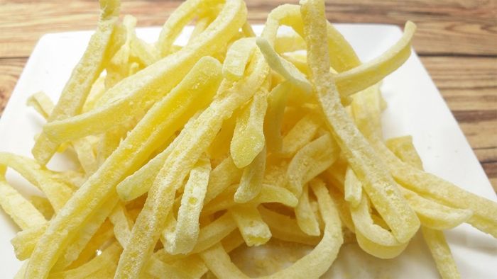 - Bước 1: Pha nước muối pha loãng để ngâm khoai lang, sau đó gọt sạch vỏ và cắt thành miếng vuông nhỏ. Ngâm khoai trong nước muối để loại bỏ nhựa và làm khoai giòn. Lọc nước vôi tôi và ngâm khoai trong 3 - 4 tiếng cho khoai giòn và cứng hơn. Rửa sạch và để ráo.