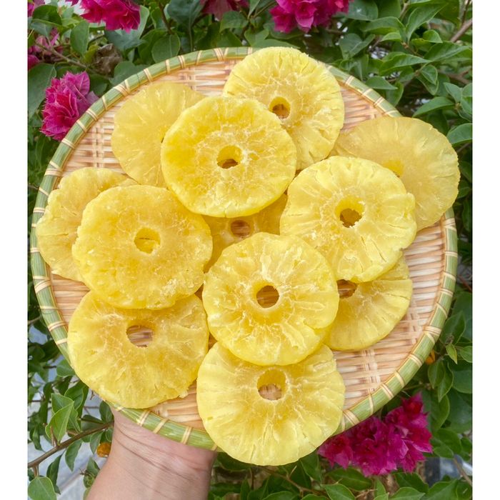 - Bước 1: Chuẩn bị thơm: Gọt vỏ, bỏ mắt và rửa sạch. Cắt thành khoanh tròn đều, độ dày từ 1,2 - 1,5cm. Pha 5 gr phèn chua vào 700 ml nước, ngâm thơm trong hỗn hợp này 6 giờ trong ngăn mát tủ lạnh.
