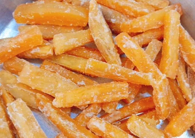 - Bước 3: Đun sôi khoai với nước đường đã ướp, sên khoai trên lửa nhỏ. Đảo nhẹ tay và tách rời từng miếng khoai để tránh nát. Sên cho đến khi nước cạn, đường khô bám đều vào khoai thì tắt bếp. Xếp khoai ra rổ để mứt khô hẳn. Bảo quản và thưởng thức dần.
