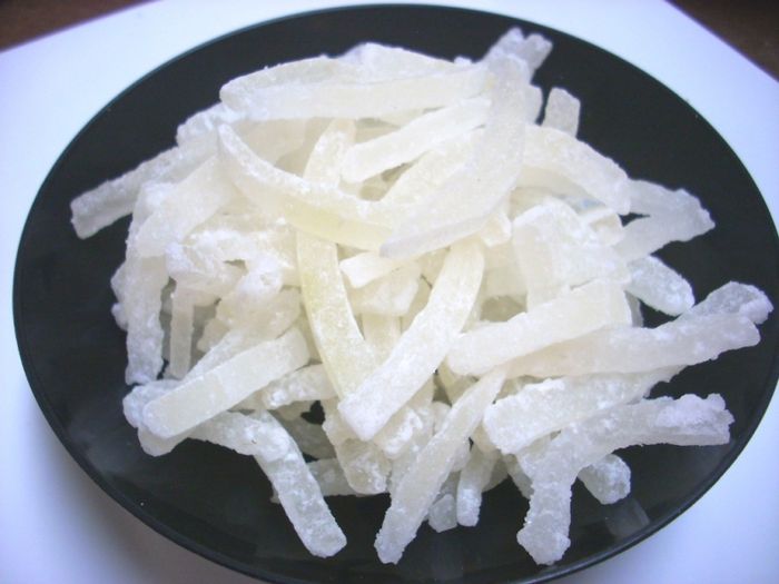 - Bước 7: Bóp nhẹ để đường bám đều lên mứt. Mứt gừng sau khi sên sẽ trắng nhạt và khô ráo.