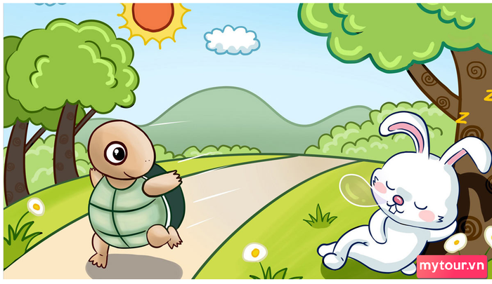 Chuyện kể về một chú thỏ nhanh nhẹn nhưng ngạo mạn, thách đấu chạy với chú rùa chậm chạp. Thỏ tự tin vượt xa rùa vì kiêu căng và quá tự tin. Nhưng nhờ sự kiên nhẫn và quyết tâm không ngừng, Rùa đã giành chiến thắng khiến thỏ phải hối hận.
