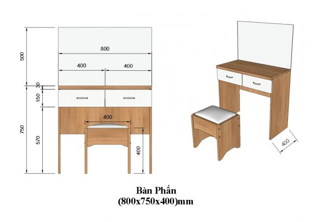 - Kích thước: Chọn kích thước phù hợp với không gian và nhu cầu sử dụng. Nếu muốn bàn trang điểm mini, hãy tham khảo kích thước chuẩn sau: