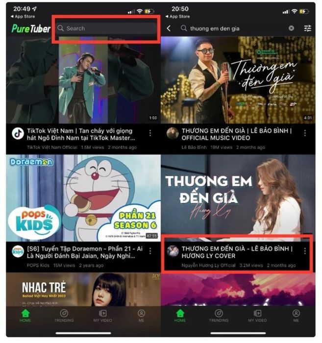 Bước 1: Mở ứng dụng lên, tại giao diện trang chủ, bạn gõ tại thanh tìm kiếm bài hát mà bạn yêu thích. Sau đó chọn video mà bạn muốn phát.