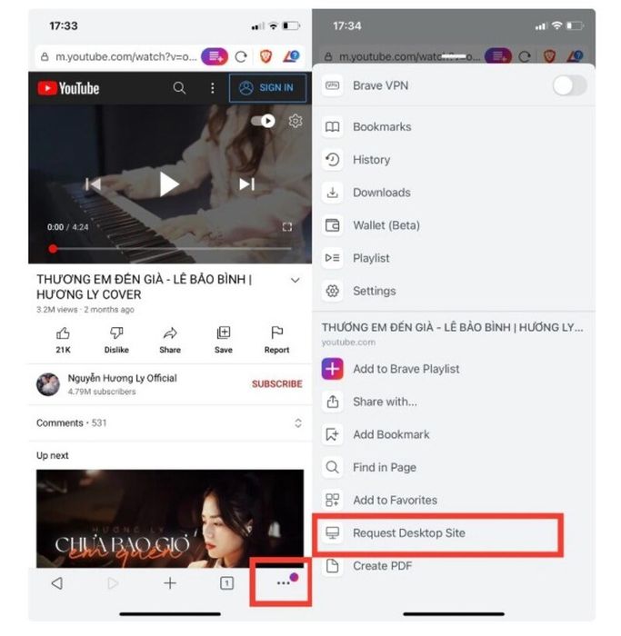 Bước 3: Để chạy nền, vào vị trí 3 chấm ở dưới, chọn Request Desktop Site. Giờ bạn có thể tắt màn hình và trải nghiệm mà không lo bị ảnh hưởng.