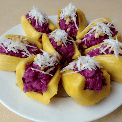Món xôi mít lá cẩm có màu sắc tím bắt mắt và hương thơm quyến rũ. Mỗi hạt xôi mít dẻo thơm, khiến bạn ăn một lần sẽ muốn thưởng thức thêm nhiều lần nữa.
