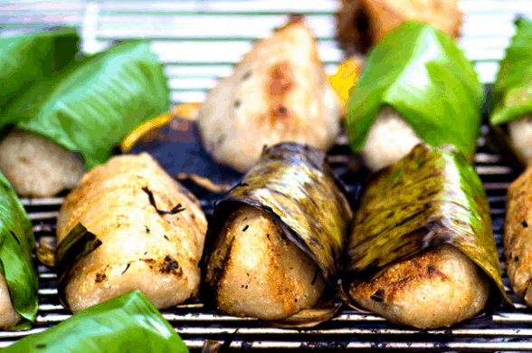 Trái chuối sứ được bọc kín trong lớp nếp nấu chín, nếp thấm đều vị cốt dừa, tạo hương thơm và vị béo ngậy. Chuối được bọc thêm lá chuối bên ngoài để giữ hương thơm của lá. Nướng đều tay để đảm bảo mặt bánh không bị khét. Khi lá chuối đã sém vàng và có mùi thơm, món ăn đã chín đúng điệu.