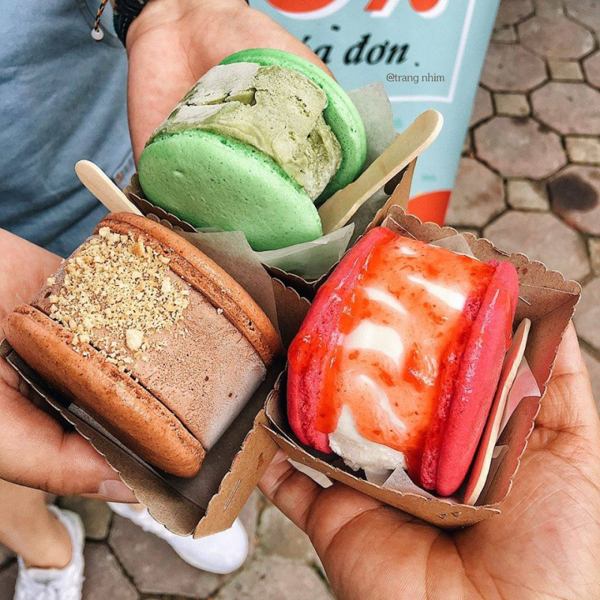 Đây là sự kết hợp độc đáo cho mùa hè năm nay - macaron kẹp kem. Sự pha trộn giữa macaron và kem tạo nên một trải nghiệm mới lạ. Việc rắc topping lên càng làm cho bức ảnh trở nên sống động và đồng thời tạo ra trải nghiệm ăn ngon mắt. Kem có vị nhạt hợp lý khi ăn kèm với macaron (tuy nhiên, có ý kiến cho rằng vẫn cảm thấy ngọt). Hiện có 6 vị kem như tiramisu, matcha, cookies, chanh leo, sô cô la và phô mai. Giá một chiếc kem macaron là 40.000 đồng/chiếc với 2 topping. Mức giá này có vẻ cao nhưng khi so sánh với giá macaron thông thường, đây là mức giá hợp lý.