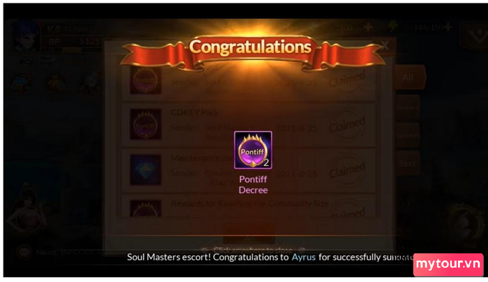 Bước 4: Nếu code đúng, bạn sẽ nhận được thông báo nhập code game Soul Land Reloaded mới nhất thành công và phần thưởng sẽ đến hộp thư. Chỉ cần mở “Thư” để kiểm tra > Bấm “Nhận” để lấy tất cả.
