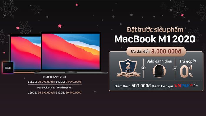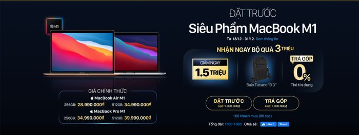 Tại Thế Giới Di Động, bạn có thể đặt trước MacBook M1 với tối thiểu 1 triệu đồng để nhận ngay bộ quà 3 triệu gồm: