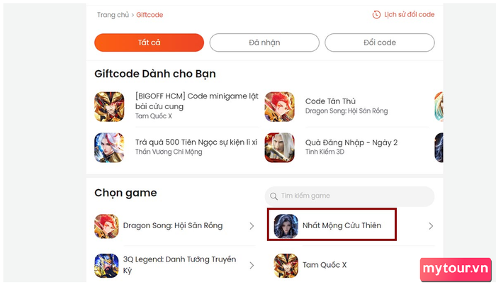 Bước 2: Chọn danh mục game Nhất Mộng Cửu Thiên trong mục Giftcode