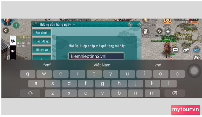 Hiện tại, nhà phát triển vẫn chưa phát hành nhiều Giftcode cho người chơi. Tuy nhiên, dưới đây, Mytour sẽ hướng dẫn bạn cách nhập mã Kiếm Hiệp Tình 2 Mobile chi tiết để bạn có trải nghiệm suôn sẻ và chuẩn bị cho các mã game sắp tới.