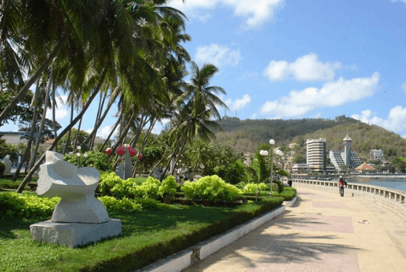 Dọc theo bờ biển là những hàng dừa, từng được biết đến với tên gọi Vịnh Hàng Dừa. Phía dưới là một công viên với đủ loại hoa tươi đẹp. Ngồi ngắm gió tại công viên, nhìn ra những hàng dừa và lắng nghe sóng biển vỗ nhẹ, thật sự thú vị!