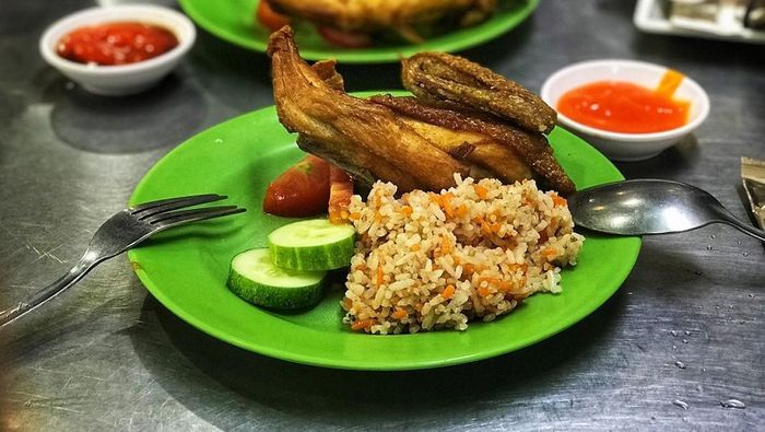 Đây là một trong những quán bán cơm gà khá nổi tiếng tại Sài Gòn. Quán chỉ bán duy nhất món cơm gà xối mỡ với miếng gà giòn tan chấm với nước tương pha ớt và ăn cùng với cơm chiên áp chảo kèm chút dưa chuột và cà chua. Miếng gà được ướp gia vị vừa ăn, được xối giòn tan, thịt bên trong vẫn giữ được độ ẩm nhất định, không bị khô. Cơm chiên cùng cà chua nghiền nên có màu bắt mắt, tạo thêm phần hấp dẫn cho món ăn.