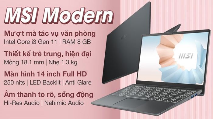 Laptop MSI Modern 14 B11MOU i3 thiết kế sang trọng, hiện đại, thu hút mọi ánh nhìn. Trọng lượng máy chỉ 1.3 kg, gọn, nhẹ, phù hợp cho di chuyển linh hoạt mà không mệt mỏi.