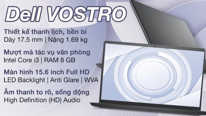Laptop Dell Vostro 3510 i3 có thiết kế đơn giản với gam màu đen hiện đại, góc bo cạnh tinh tế, phù hợp cho mọi đối tượng sử dụng. Với trọng lượng 1.69 kg và độ mỏng 17.5 mm, máy dễ dàng di chuyển và là sự lựa chọn hoàn hảo cho người dùng năng động.