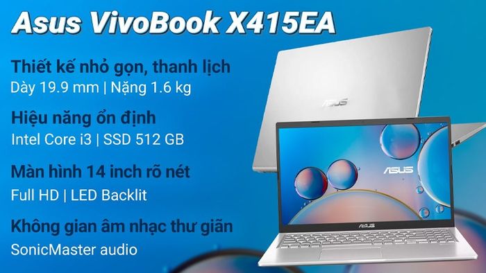 Asus VivoBook X415EA i3 mang lại vẻ đẹp sang trọng, thanh lịch, và phong cách thiết kế độc đáo. Màn hình viền mỏng 14 inch Full HD giúp trải nghiệm hiển thị tuyệt vời với độ chi tiết cao và màu sắc chân thực.