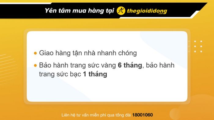 - Bảo hành trang sức vàng trong 6 tháng, trang sức bạc trong 1 tháng.