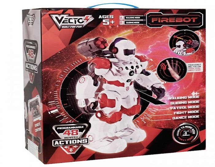 Robot chiến đấu điều khiển từ xa Firebot 8088 của Vecto được thiết kế với khả năng phóng tên, nhảy múa điêu luyện, có thể lập trình với 48 bước và điều khiển bằng remote hoặc bằng tay. Được làm từ chất liệu nhựa cao cấp không chứa chất độc hại BPA, an toàn cho trẻ, giúp trẻ thỏa sức vui chơi và sáng tạo.
