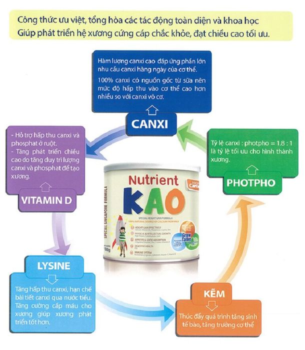 – Trong sữa Nutrient Kao 700g, canxi cao giúp đáp ứng nhu cầu hàng ngày của trẻ, cùng vitamin D, kẽm, lysine, photpho tăng cường hệ xương khớp và phát triển chiều cao.