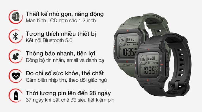Kết nối bluetooth với điện thoại giúp quản lý công việc và sức khỏe hiệu quả, cùng thời lượng pin 28 ngày. Đồng hồ Neo không chỉ đơn giản mà còn hỗ trợ theo dõi nhịp tim, giấc ngủ, đếm bước chân, và tính lượng calories tiêu thụ trong 2 giờ sạc đầy.