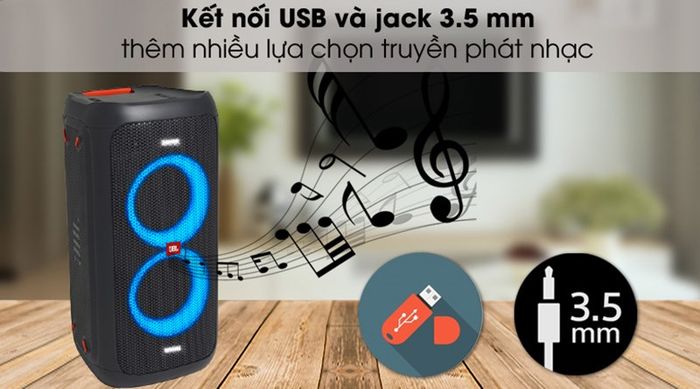 Loa Bluetooth JBL Partybox 100 Đen với bộ nút điều khiển tiện dụng ngay trên nắp loa. Nhiều cổng kết nối đa dạng như USB, jack 3.5 mm, jack 6.5, dễ dàng kết nối với hầu hết các thiết bị điện tử hiện nay.