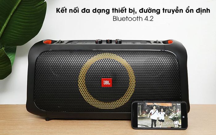 Loa Bluetooth JBL Partybox On the Go với đèn LED nhấp nháy theo nhịp nhạc, tạo không khí hứng thú. Kết nối mượt mà qua Bluetooth 4.2.