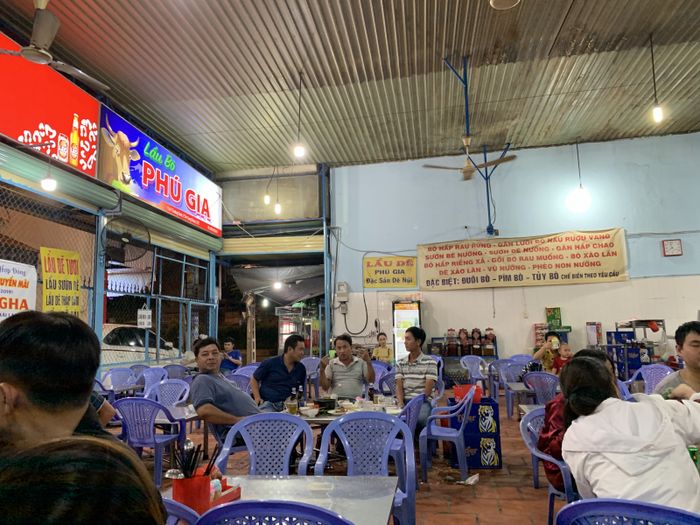 Đặc trưng của Lẩu bò Phú Gia là thịt bò tơ thái miếng dày, giữ mỡ để khi chín, thịt vẫn giữ độ ẩm và ngon miệng. Phần gân bò tại đây làm nên điểm độc đáo, gân mềm nhừ, hòa quyện vị ngậy béo trong miệng. Gù bò, phần thịt ở lưng gần cổ con bò, được nhúng với ớt xiêm xanh, mang lại trải nghiệm ẩm thực mới lạ. Ngoài hai món nổi bật, quán còn nhiều món hấp dẫn khác như gỏi bắp bò tái, dựng gân xào cải chua, dựng gần xào sa tế, phục vụ những buổi nhậu gia đình hoặc bạn bè.