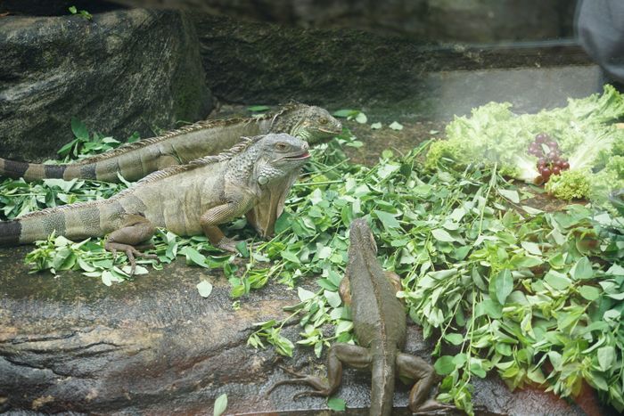 Những chú thú này được gọi là cự đà (Iguana). Có một con có màu cam nổi bật giữa bầy đàn với màu xanh.