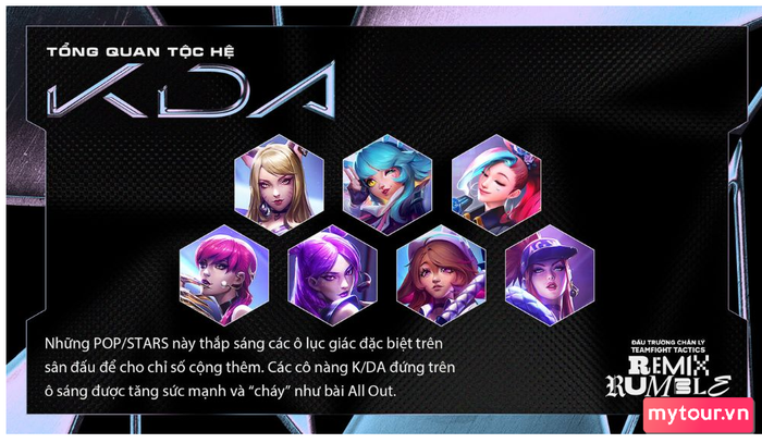 Những cô nàng KDA quyến rũ đồng lòng để tạo ra một tộc hệ mạnh mẽ. KDA với 7 thành viên hứa hẹn sẽ làm mới các chiến thuật với sân khấu lớn, gia tăng chỉ số cho các tướng đứng trên đó khi kích hoạt tộc hệ.