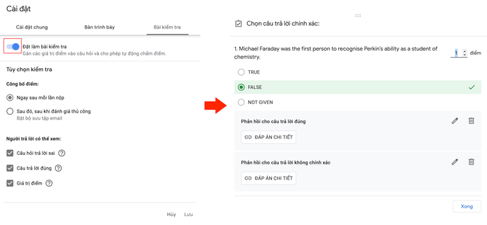 Ưu điểm của Google Form là bạn có thể kích hoạt tính năng tự động chấm điểm, nhập đáp án và ghi điểm cho từng câu.