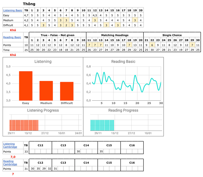 Thông: Listening - 7.0, Reading - 7.0
