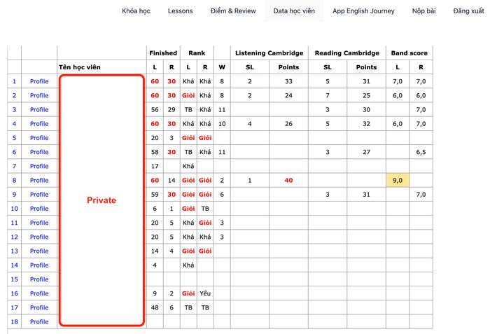 Như vậy, mình có thể theo dõi và biết được điểm số của học viên, xem họ làm bài có đều không và có tiến bộ theo thời gian không. Học viên cũng có thể tự theo dõi tiến độ của mình để điều chỉnh phương pháp học và cải thiện kỹ năng một cách hiệu quả hơn.