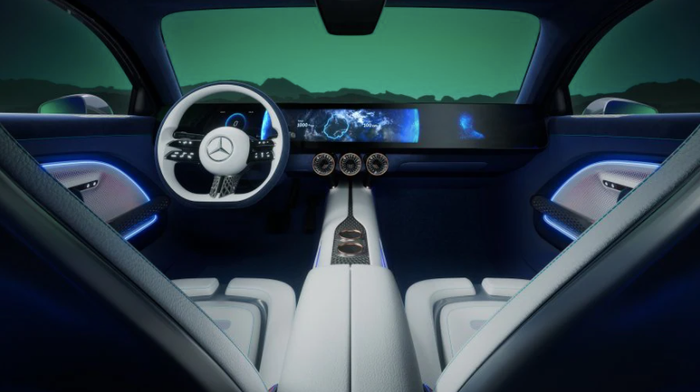 The interior features a hyperscreen extending the length of the front. Credit: MercedesMặc dù có dải hành trình dài, Mercedes đã lựa chọn một bộ pin nhỏ, sử dụng anot silicon với vật liệu siêu nhẹ từ Formula One. Theo công ty, “điều này cho phép pin của EQXX lưu trữ 100 kWh, trong khi chiếm 50% không gian và nặng 30% ít hơn so với pin có dung lượng tương đương.”