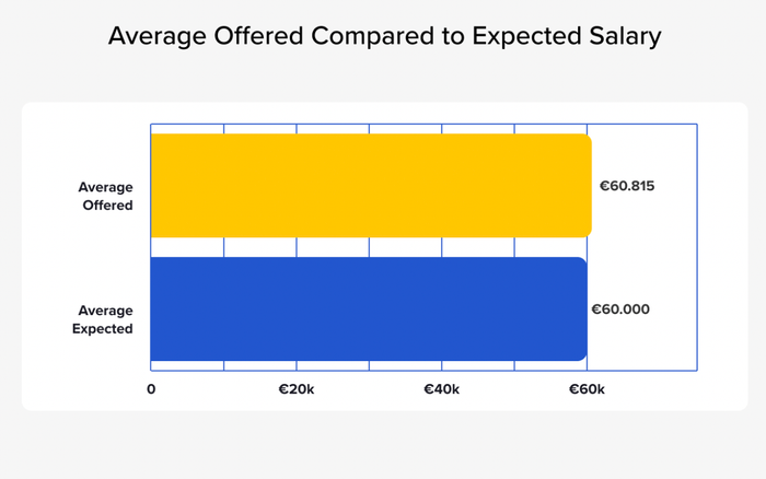 Gần như luôn có sự khác biệt giữa mong đợi và hiện thực. Mức lương dự kiến và mức lương được đề xuất cho nhà khoa học dữ liệu là một trong những trường hợp đặc biệt đó. Các công ty đều đề xuất mức trung bình là €60.8k, trong khi kỳ vọng của những người tài năng đối với mức lương khởi điểm là €60k.