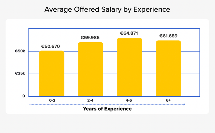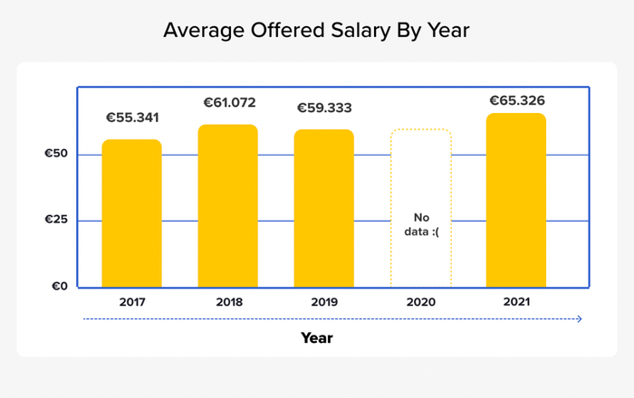 Mức lương được đề xuất bởi các công ty vào năm 2019 trung bình là khoảng €59.3k. Chúng tôi nghi ngờ đây là một sự điều chỉnh do một sự tăng đột ngột có thể là do sự phổ biến của công việc. Nhưng sự giảm nhẹ này dường như là một ngoại lệ và không nên làm giảm sức hấp dẫn.