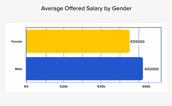Trung bình, các công ty đề xuất mức lương khởi điểm là €62k cho nam giới, trong khi chỉ đề xuất €55k cho phụ nữ.