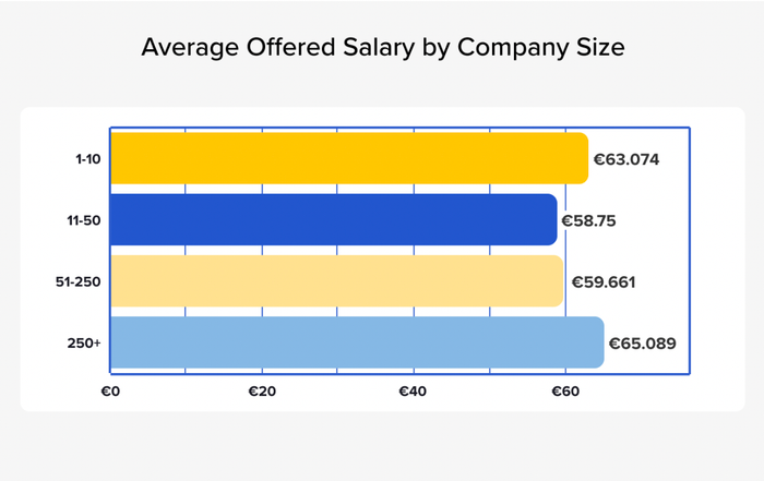 Mức lương trung bình tại các công ty có ít hơn mười nhân viên là €63k, trong khi các công ty doanh nghiệp đề xuất trung bình là €65.0k.