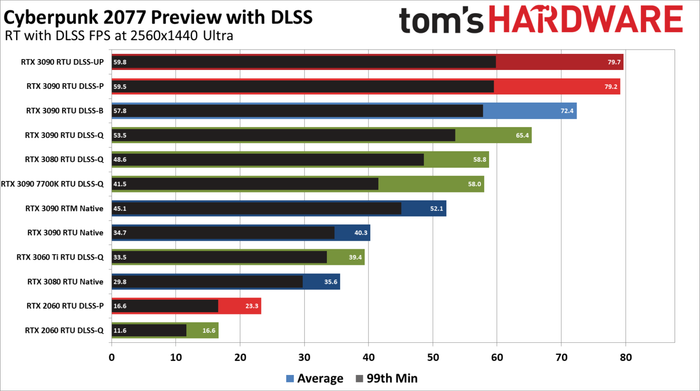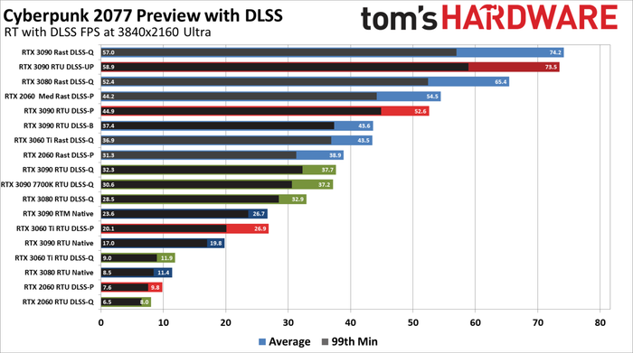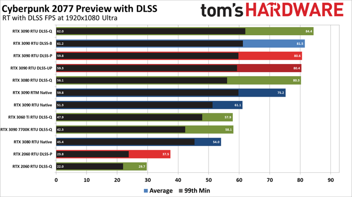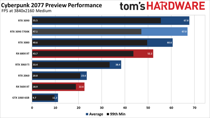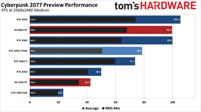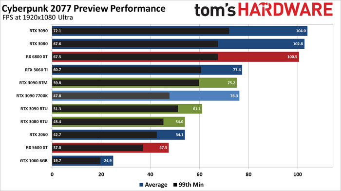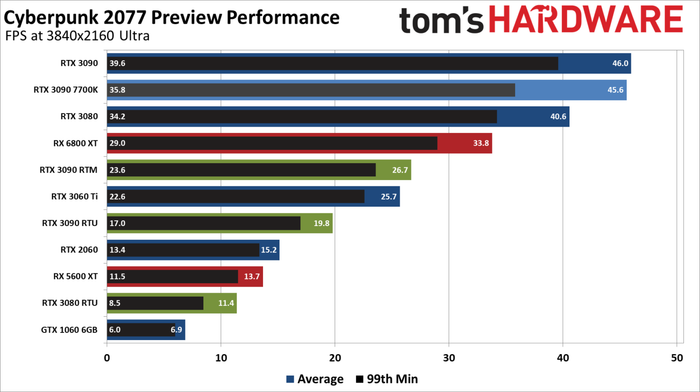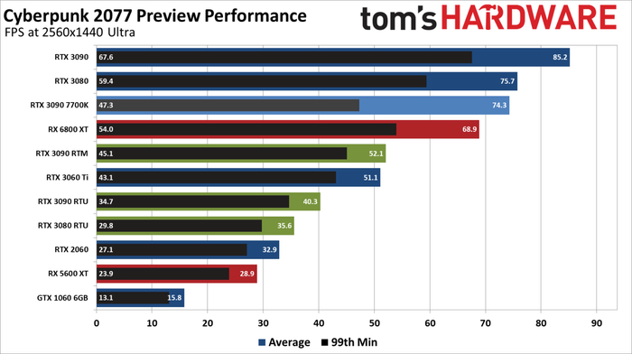 Cuộc thử nghiệm của Tom's Hardware được thực hiện với phiên bản driver mới nhất cho Cyberpunk 2077. Trò chơi được thử ở độ phân giải 1080p, 1440p và 2160p với 2 cài đặt đồ họa là Trung bình và Cao cấp. Ngoài ra, công nghệ Ray Tracing (RTX) cũng được đánh giá ở 2 mức Trung bình và Cao cấp và đặc biệt với các card đồ họa của Nvidia, 4 cài đặt DLSS bao gồm Hiệu suất, Cân bằng, Chất lượng và Siêu Chất lượng cũng được thử nghiệm.
