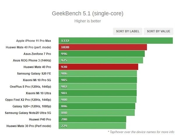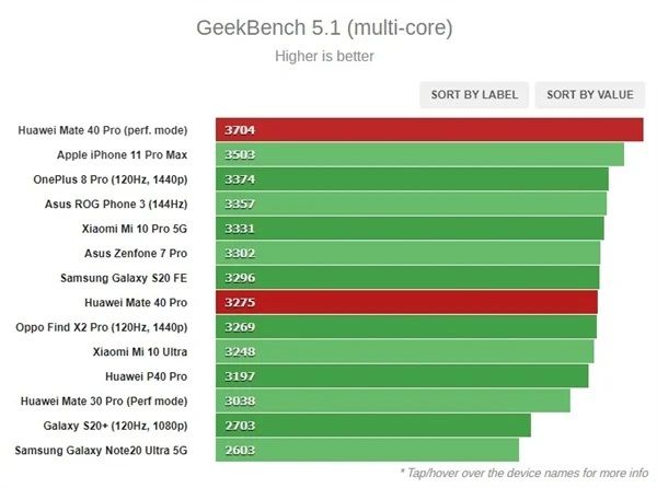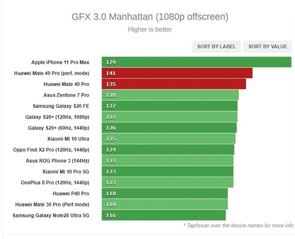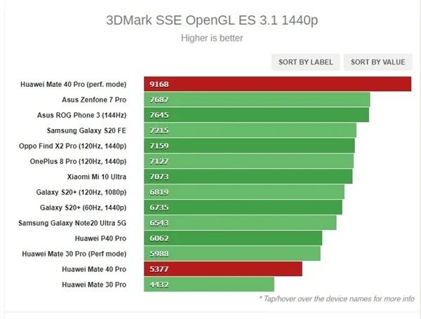 Trong bài kiểm tra GFXBench, hiệu năng của Mate 40 Pro không có sự khác biệt lớn so với các điện thoại có màn hình 1080p khác trong bài test onscreen do màn hình độ phân giải cao có thể ảnh hưởng đến hiệu suất của nó. Tuy nhiên, điểm số của nó cao hơn đáng kể so với các flagship có màn hình 1440p khác trong năm 2020.Bài kiểm tra AI Benchmark và Antutu