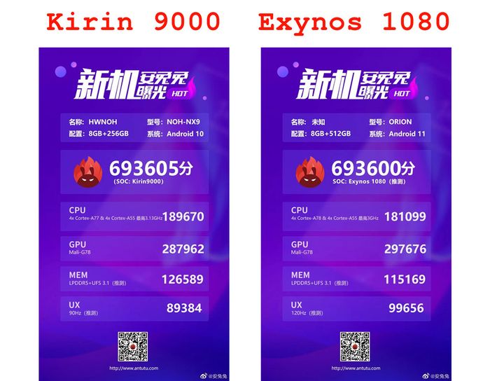 Điểm Antutu rò rỉ từ Gizmochina cho thấy Kirin 9000 đạt điểm số cực kỳ cao lên đến 693,605 điểm, ngang ngửa với điểm số của Samsung Exynos 1080, một chipset 5nm mới từ Samsung. Anh em nghĩ sao về hiệu năng của Kirin 9000, con chip Kirin này có thể là cuối cùng từ Huawei này?