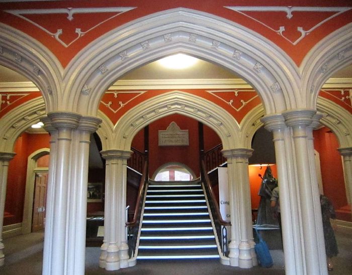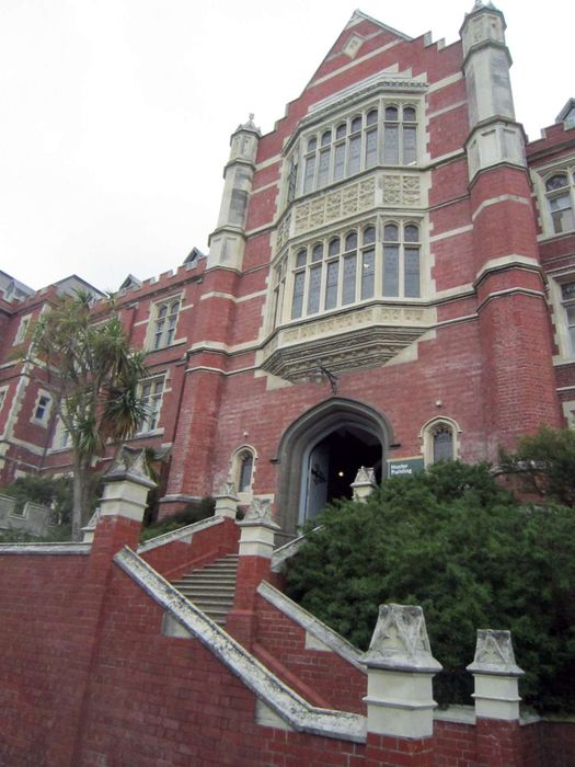Kiến trúc của Tòa nhà Hunter lấy cảm hứng từ thời kỳ Gothic của vua Edward, với mặt tiền được làm từ gạch đỏ và đá Oamaru, loại đá đặc trưng của vùng Oamaru, Otago, New Zealand. Bước vào bên trong, bạn sẽ bị quyến rũ bởi những họa tiết tinh xảo trên cửa, mái vòm, và cầu thang. Nhìn những bậc thang uốn lượn bên trong, bạn có thể liên tưởng đến học viện phù thủy Hogwarts trong truyện Harry Potter. Trải nghiệm lang thang tại đây làm cho mình liên tục khám phá những tác phẩm nghệ thuật trưng bày trên hành lang và trong các sảnh của tòa nhà.