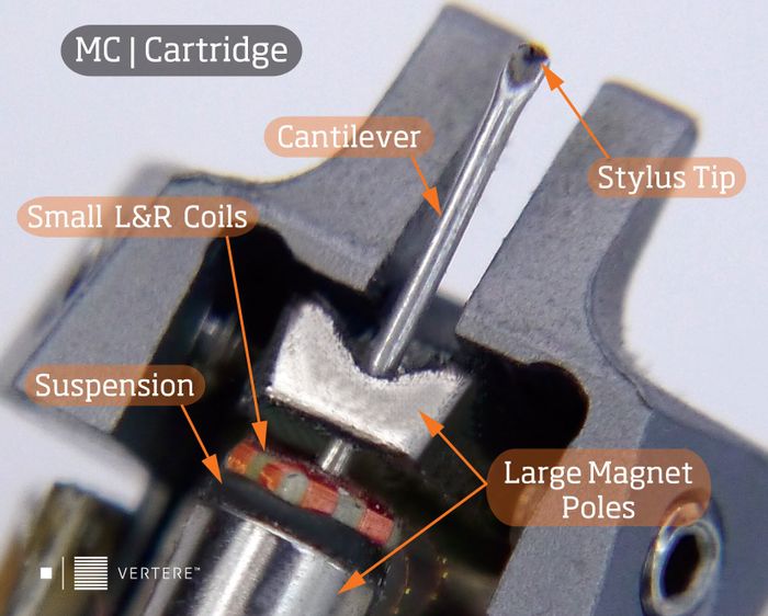 Về mặt cơ học, thiết kế của MC tương tự như MM nhưng có điểm khác biệt là dây coil được đặt ở chân thân kim thay vì ở đầu cartridge như MM. Điều này làm cho MC hoạt động theo nguyên lý điện động để truyền tải dòng tín hiệu với hiệu điện thế thấp hơn. Để khuếch đại hiệu quả, preamp cần có gain cao (trở kháng input thường trong khoảng 20 - 1000Ω).