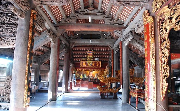 Tòa đại đình được xây dựng với 7 gian và mái ngói mũi hài đầu đao cong vút. Khung cột gỗ lim cao 5m, mỗi cột chu vi gần 2m, tạo nên sự vững chãi và khả năng chịu lực cao.