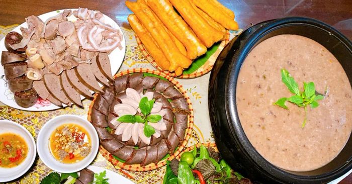 The highlight of this delicious Hanoi offal porridge restaurant is the bubbling pot of offal porridge with various types of offal such as ox tripe, pork stomach, intestines, and hot, steaming blood pudding. The brownish hue of the blood pudding porridge, combined with fragrant herbs like coriander and basil, is incredibly appetizing. And of course, the offal dishes at Hai Map and other offal porridge restaurants in Hanoi are always hygienically prepared, leaving no dirt or unpleasant odor. The blood pudding is carefully cooked with all the ingredients immersed in hot porridge, creating an irresistible dish.