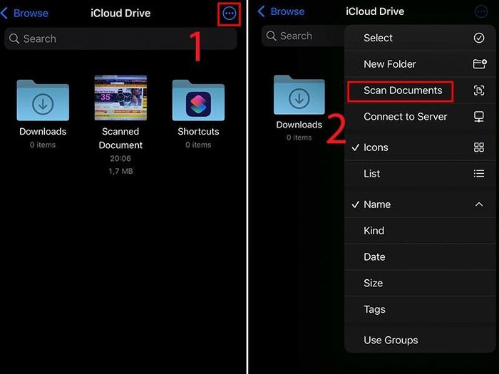 Step 2: Choose 'Browse' and tap the three dots at the top right corner of the interface. Then, press Scan Documents to proceed.